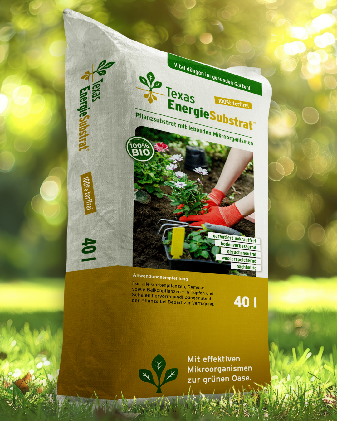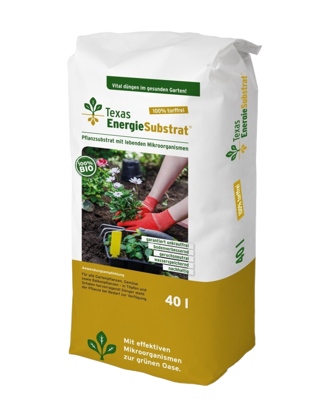 Texas EnergieSubstrat is een aardvochtig, gebruiksklaar plantensubstraat. Na het losmaken van het plantgebied het substraat aanbrengen, tot 1:1 vermengen met de bestaande grond, ook direct te gebruiken in potten en schalen. Zet de planten erin, druk ze naar beneden en geef ze water. De ondergrond altijd gelijkmatig vochtig houden en na ca. 6 weken opnieuw bemesten.